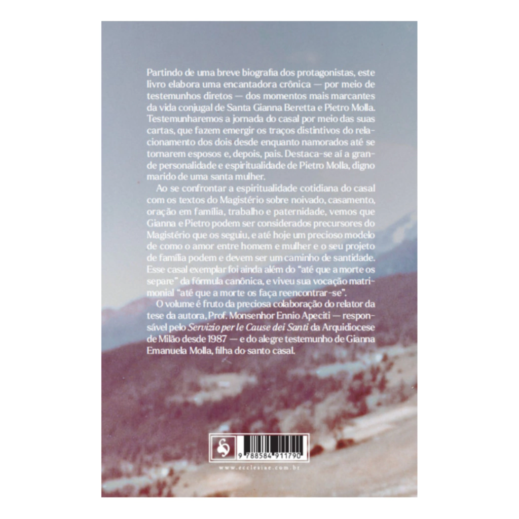 Partindo de uma breve biografia dos protagonistas, este livro elabora uma encantadora crônica — por meio de testemunhos diretos — dos momentos mais marcantes da vida conjugal de Santa Gianna Beretta e Pietro Molla. Testemunharemos a jornada do casal por meio das suas cartas, que fazem emergir os traços distintivos do relacionamento dos dois desde enquanto namorados até se tornarem esposos e, depois, pais. Destaca-se aí a grande personalidade e espiritualidade de Pietro Molla, digno marido de uma santa mulher.